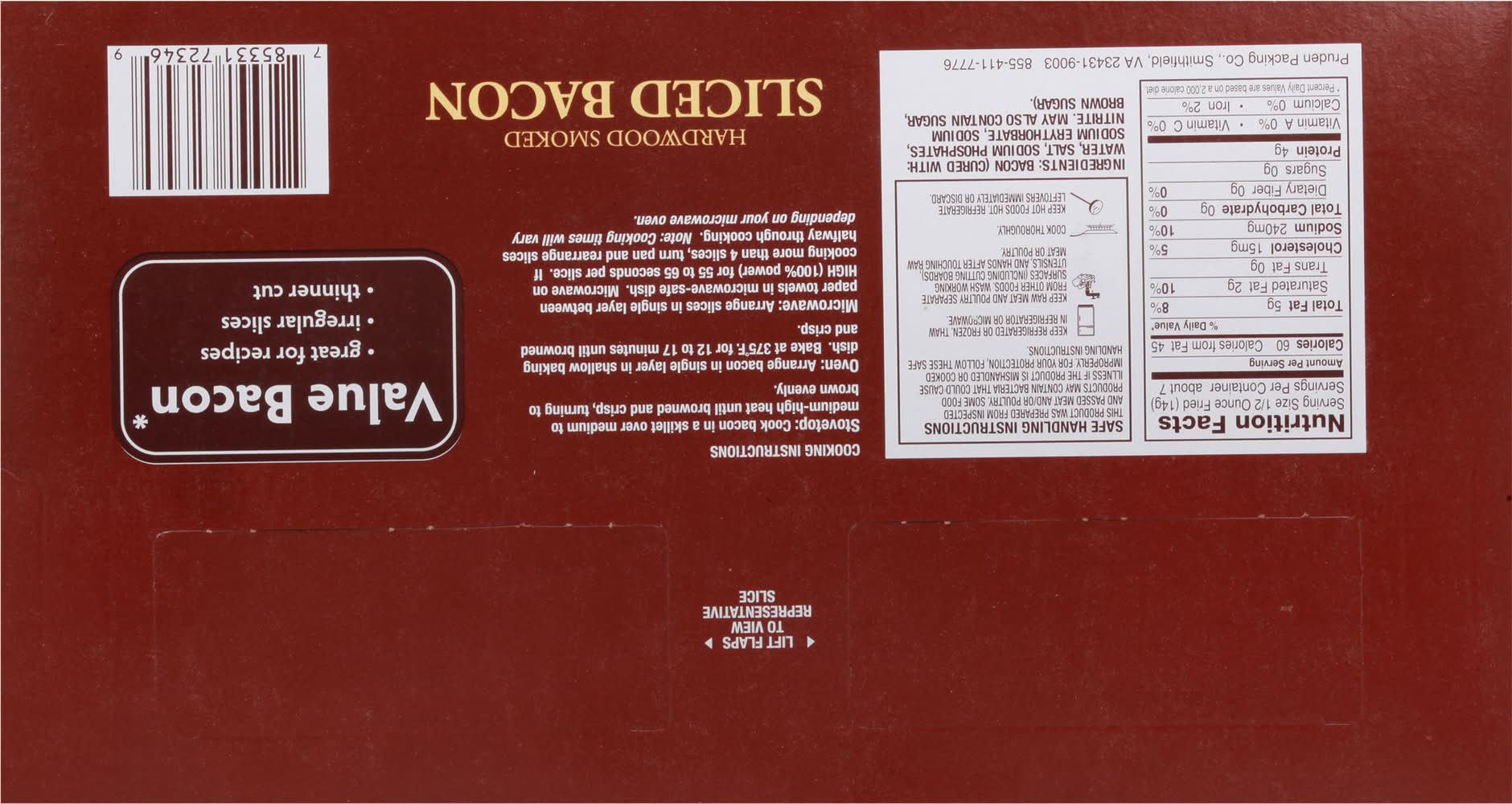Sliced Bacon, Hardwood Smoked • Number of servings: 7 • Pruden Packing Co., Smithfield, VA, 23431-9003, Ph: 855-411-7776
