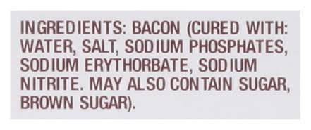 Ingredients: Bacon (Cured with: Water, Salt, Sodium Phosphates, Sodium Erythorbate, Sodium Nitrite. May Also Contain Sugar, Brown Sugar)