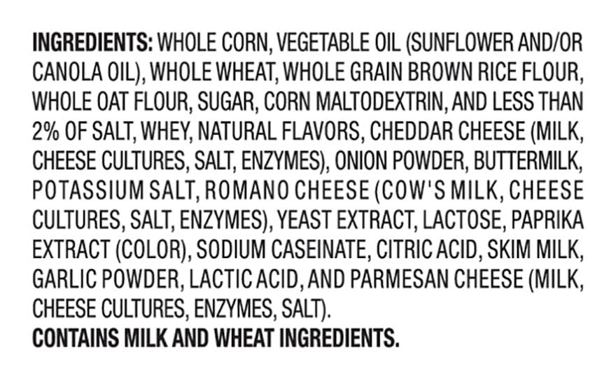 Ingredients: Whole Corn, Vegetable Oil (Sunflower and/or Canola Oil), Whole Wheat, Whole Grain Brown Rice Flour, Whole Oat Flour, Sugar, Corn Maltodextrin, and Less than 2% of Salt, Whey, Natural Flavors, Cheddar Cheese (Milk, Cheese Cultures, Salt, Enzymes), Onion Powder, Buttermilk, Potassium Salt, Romano Cheese (Cow's Milk, Cheese Cultures, Salt, Enzymes), Yeast Extract, Lactose, Paprika Extract (Color), Sodium Caseinate, Citric Acid, Skim Milk, Garlic Powder, Lactic Acid, and Parmesan Cheese (Milk, Cheese Cultures Enzymes, Salt) Contains: Milk, Wheat, Oat, Lactose
