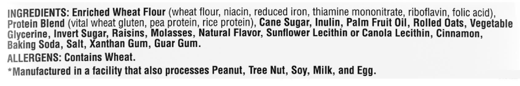 Ingredients: Enriched Wheat Flour (Wheat Flour, Niacin, Reduced Iron, Thiamine Mononitrate, Riboflavin, Folic Acid), Protein Blend (Vital Wheat Gluten, Pea Protein, Rice Protein), Cane Sugar, Inulin, Palm Fruit Oil, Rolled Oats, Vegetable Glycerine, Invert Sugar, Raisins, Molasses, Natural Flavor, Sunflower Lecithin or Canola Lecithin, Cinnamon, Baking Soda, Salt, Xanthan Gum, Guar Gum Contains: Wheat, Gluten, Oat, Peanuts, Tree Nuts, Soybeans, Milk, Eggs