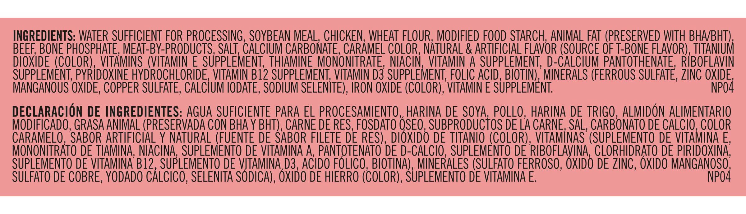 Ingredients: Water Sufficient For Processing, Soybean Meal, Chicken, Wheat Flour, Modified Food Starch, Animal Fat (preserved With Bha/bht), Beef, Bone Phosphate, Meat-by-products, Salt, Calcium Carbonate, Choline Chloride, Caramel Color, Natural Artificial Flavor (source Of T-bone Flavor), Titanium Dioxide (color), Vitamins (vitamin E Supplement, Thiamine Mononitrate, Niacin, Vitamin A Supplement, D-calcium Pantothenate, Riboflavin Supplement, Pyridoxine Hydrochloride, Vitamin B12 Supplement, Vitamin D3 Supplement, Folic Acid, Biotin), Iron Oxide (color), Minerals (ferrous Sulfate, Zinc Oxide, Manganous Oxide, Copper Sulfate, Calcium Iodate, Sodium Selenite), Vitamin E Supplement Contains: 'Contains Soybeans', 'Contains Wheat'