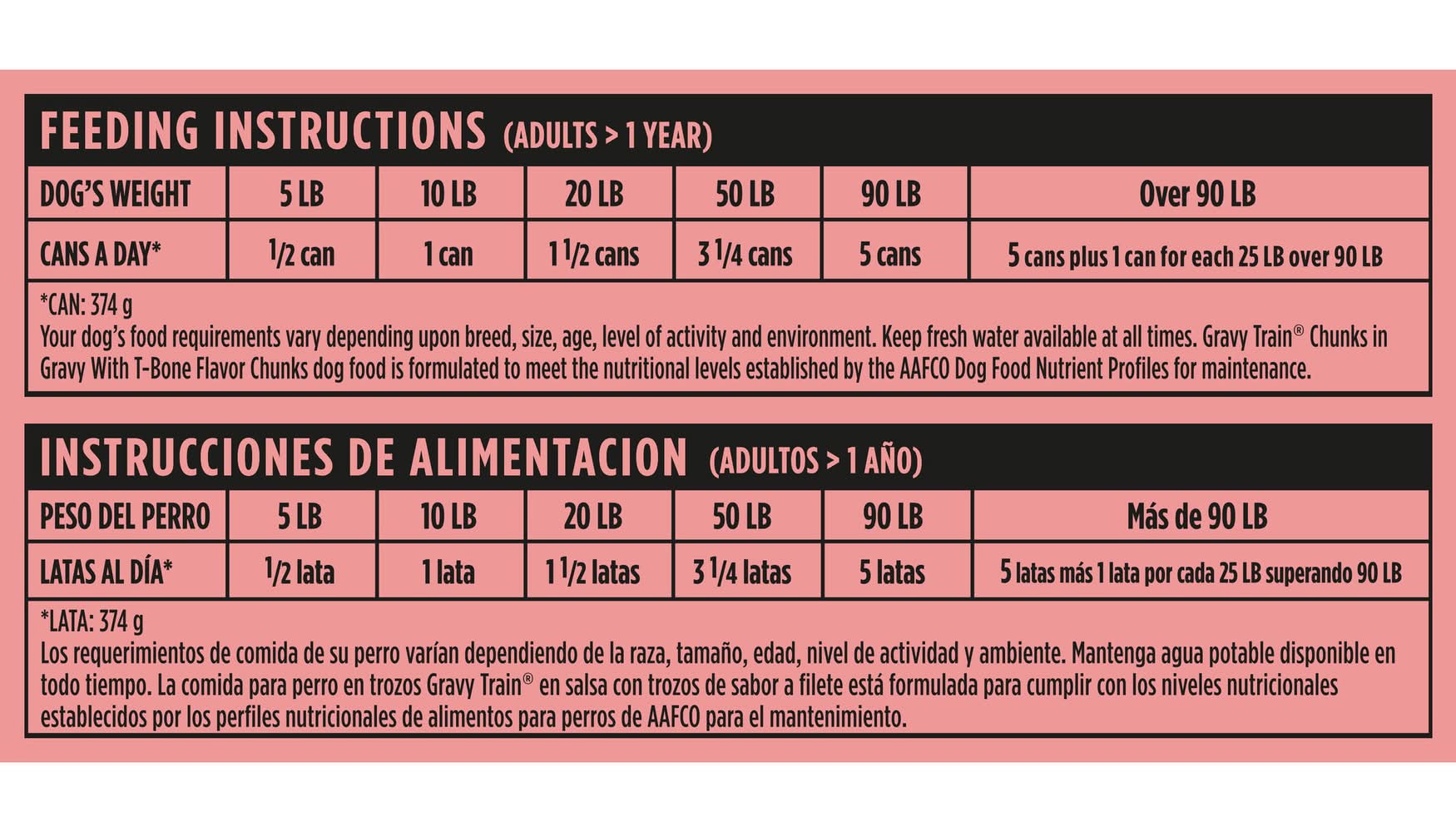 Complete and balanced nutrition for adult dogs. feeding instructions (adults grater than 1 year): 5 lb (dogs weight): 1/2 can (cans a day (can: 374 g)); 10 lb (dogs weight): 1 can (cans a day (can: 374 g)); 20 lb (dogs weight): 1-1/2 cans (cans a day (can: 374 g)); 50 lb (dogs weight): 3-1/4 cans ((cans a day (can: 374 g)); 90 lb (dogs weight): 5 cans (cans a day (can: 374 g)); over 90 lb (dogs weight): 5 can plus 1 can for each 25 lb over 90 lb (cans a day (can: 374 g)); your dog food requirement vary depending upon breed, size, age, level of activity and environment. keep fresh water available at all times.