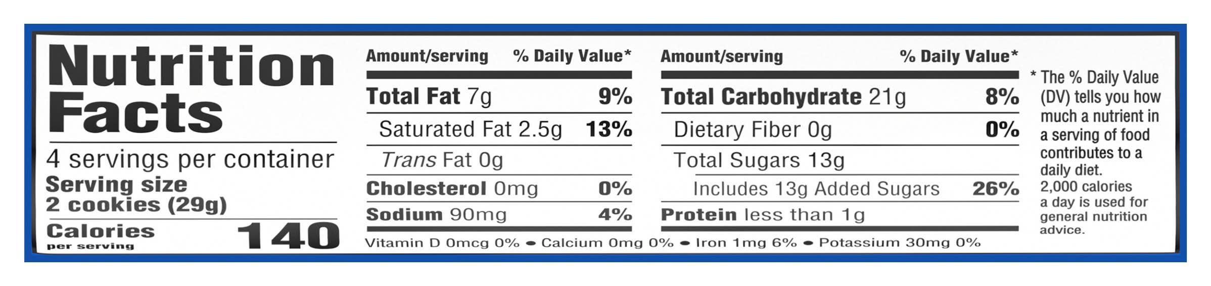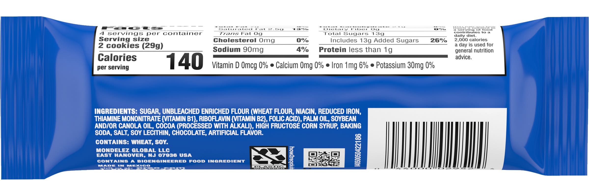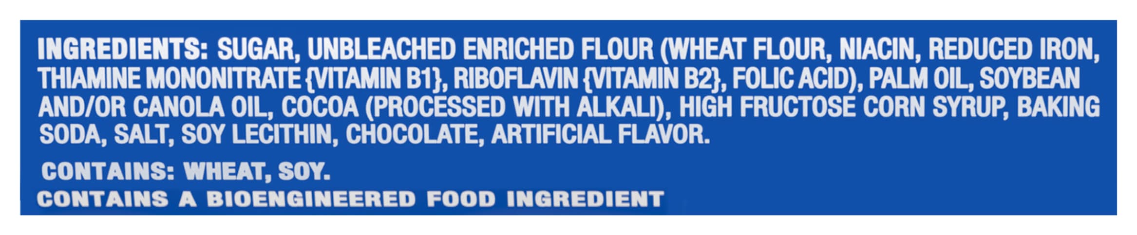Ingredients: INGREDIENTS: SUGAR, UNBLEACHED ENRICHED FLOUR (WHEAT FLOUR, NIACIN, REDUCED IRON, THIAMINE MONONITRATE {VITAMIN B1}, RIBOFLAVIN {VITAMIN B2}, FOLIC ACID), PALM OIL, SOYBEAN AND/OR CANOLA OIL, COCOA (PROCESSED WITH ALKALI), HIGH FRUCTOSE CORN SYRUP, BAKING SODA, SALT, SOY LECITHIN, CHOCOLATE, ARTIFICIAL FLAVOR.CONTAINS: WHEAT, SOY. Contains: Wheat, Soy