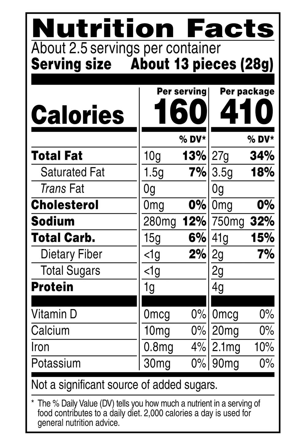 Ingredients: Enriched Corn Meal (Corn Meal, Ferrous Sulfate, Niacin, Thiamin Mononitrate, Riboflavin, Folic Acid), Vegetable Oil (Corn, Canola, and/or Sunflower Oil), Maltodextrin (Made from Corn), Salt, and Less than 2% of Sugar, Artificial Color (Red 40 Lake, Yellow 6 Lake, Yellow 6, Yellow 5), Monosodium Glutamate, Yeast Extract, Citric Acid, Cheddar Cheese (Milk, Cheese Cultures, Salt, Enzymes), Hydrolyzed Corn Protein, Onion Powder, Whey, Natural Flavors, Garlic Powder, Whey Protein Concentrate, Buttermilk, Corn Syrup Solids, Sodium Diacetate, Disodium Inosinate, Disodium Guanylate, Sodium Caseinate, and Skim Milk Contains: Milk, Corn