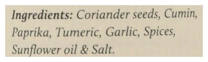 Ingredients: Coriander Seeds, Cumin, Paprika, Turmeric, Garlic, Spices, Sunflower Oil & Salt