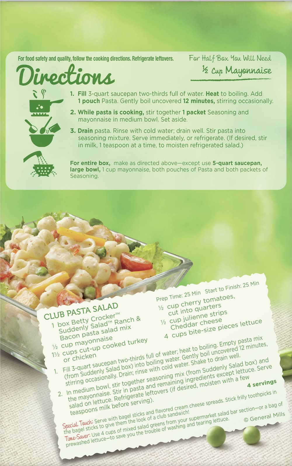 Directions for use: For food safety and quality, follow the cooking direction. For half box you will need 1/2 cup mayonnaise. Directions: 1. Fill 3-quart saucepan two-thirds full of water. Heat to boiling. Add 1 pouch pasta. Gently boil uncovered 12 minutes, stirring occasionally. 2. While pasta is cooking, stir together 1 packet seasoning and mayonnaise in medium bowl. Set aside. 3. Drain pasta. Rinse with cold water; drain well. Stir pasta into seasoning mixture. Serve immediately, or refrigerate. (if desired, stir in milk, 1 teaspoon at a time, to moisten refrigerated salad). For entire box, make as directed above - except use 5-quart saucepan, large bowl, 1 cup mayonnaise, both pouches of pasta and both packets of seasoning. Stir-In Ideas: Stir any of the following into your finished salad: 2 cups cubed cooked chicken, turkey or ham; 1/2 cup quartered cherry or grape tomatoes; 2 tablespoons sliced green onions; 1/2 cup chopped cucumber or 1 cup halved zucchini slices; 1 cup chopped fresh broccoli. Refrigerate leftovers. Storage recommendation: Refrigerate leftovers.