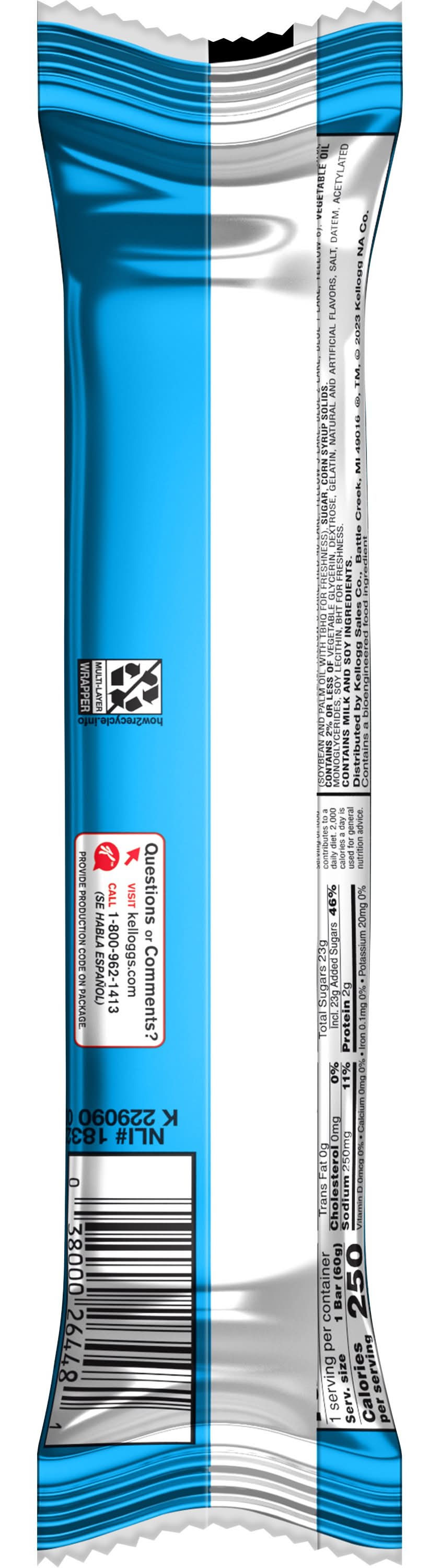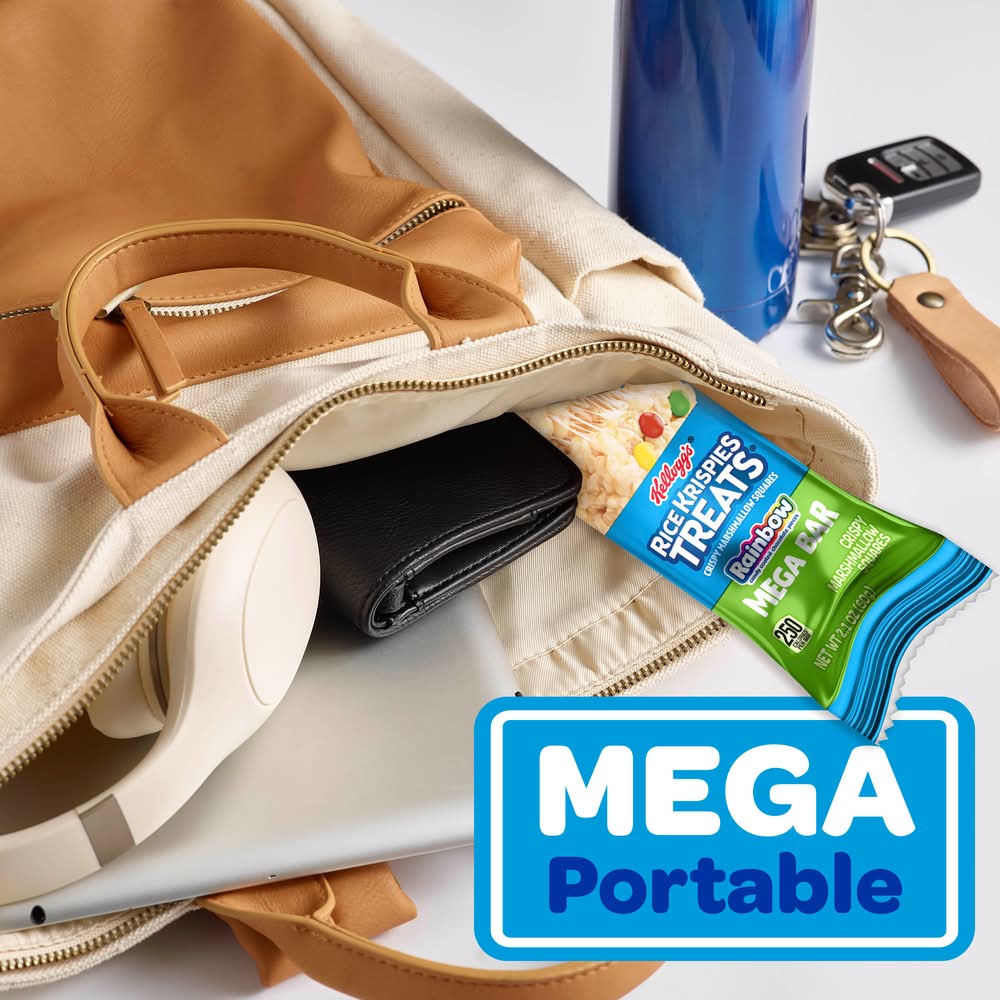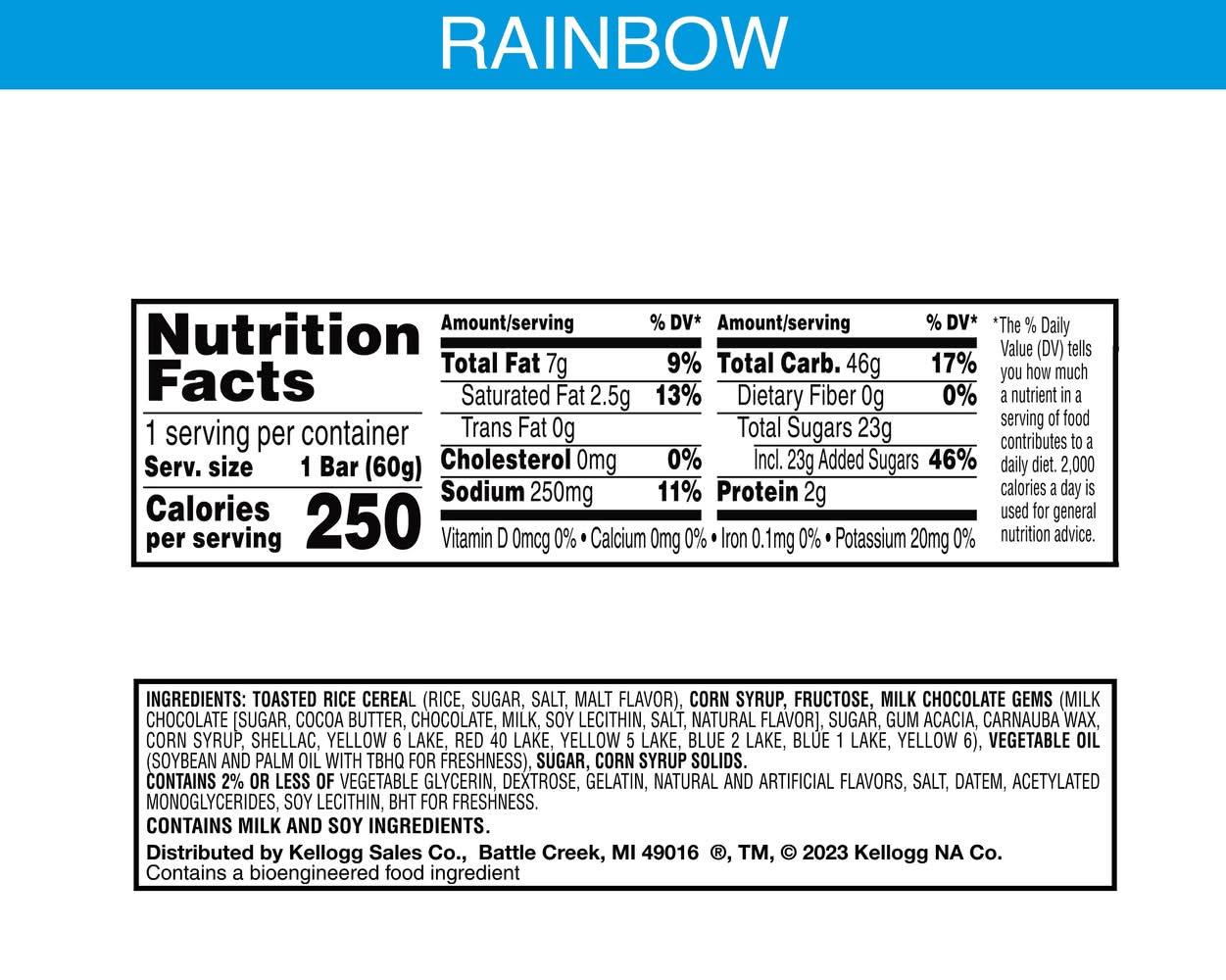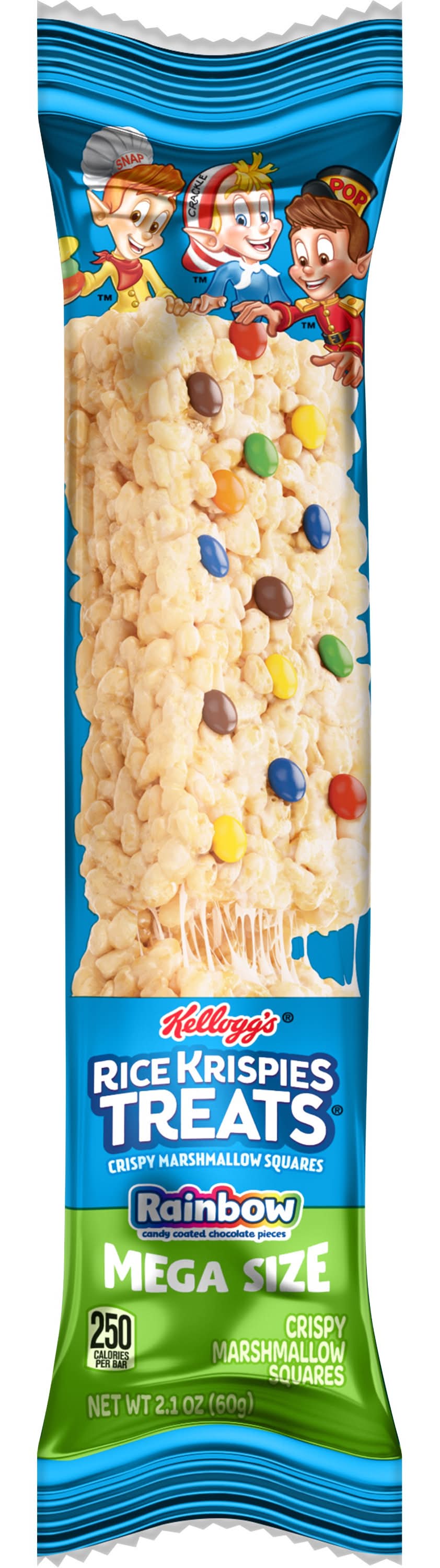 Enjoy the fun of everyday moments with the irresistible taste of Rice Krispies Treats Rainbow Mega Bars Large Marshmallow Snack Bars. Every bar starts with oven-toasted puffed rice cereal, candy-coated chocolate pieces, and the taste of chewy, gooey marshmallows. A classically delicious snack, these individually wrapped marshmallow bars are stuffed with sweet marshmallowy flavor, perfect for enjoying together as a family; Each package contains one marshmallow-flavored bar that's perfect for snacking at school, the office, lunchtime, at the game, and more. Rice Krispies Treats Mega Bars make great additions to goodie bags, gift baskets, or as a surprise in a care package. Satisfy your sweet craving with the marshmallowy goodness and on-the-go convenience of Rice Krispies Treats Mega Bars Large Marshmallow Snack Bars. Kellogg Sales Co., Battle Creek,MI,49016