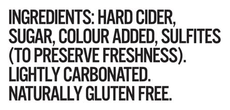 Ingredients: Hard Cider, Sugar, Colour Added, Sulfites (To Preserve Freshness) Contains: Sulfites