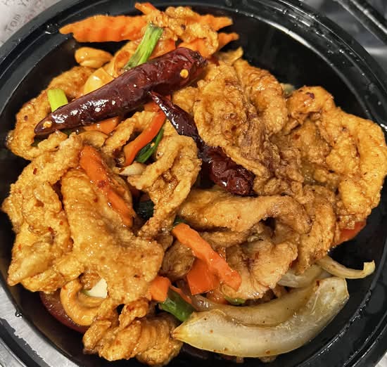 A choice of protein(breaded) sautéed with yellow onion, green onion, carrots, bell pepper, dried chili, and cashew nuts in Thai sauce. Served with jasmine rice.