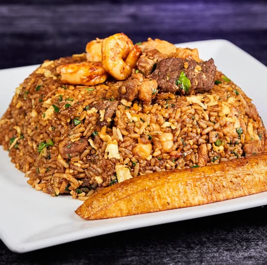 Ecuadorian dish: fried rice with chicken, shrimp, bacon, peppers, peas, scrambled eggs, spices, and herbs.