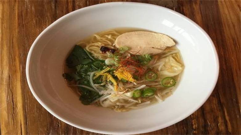 Clear chicken and bonito broth with chicken chashu, spicy Yuzu paste, Yuzu juice, blend salt, and chopped jalapeños, cilantro, bean sprouts, cabbage, scallions, seasoned egg, fresh garlic, and homemade chili paste.