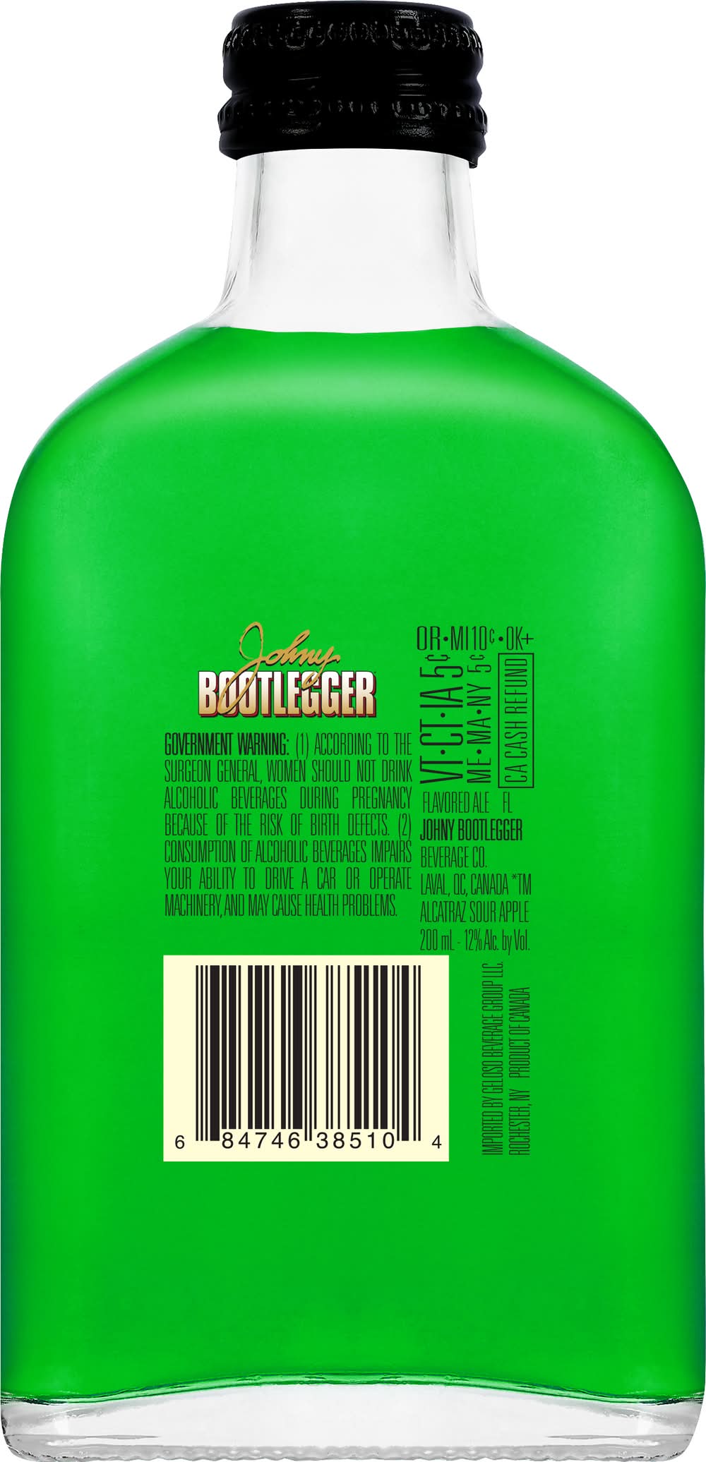 Johny Bootlegger is inspired by the Prohibition era of the 1920s – where many creative cocktails were invented in speakeasies. It’s a great choice when a very tasty, spirited beverage is desired. At 12% alcohol by volume, and nine great flavors to choose from, Johny Bootlegger lives up to the legend. • Brand: Johny bootlegger • Flavor: Sour apple • Alcohol by volume: 12% • Medium light bodied • Suggested glassware: pint glass
