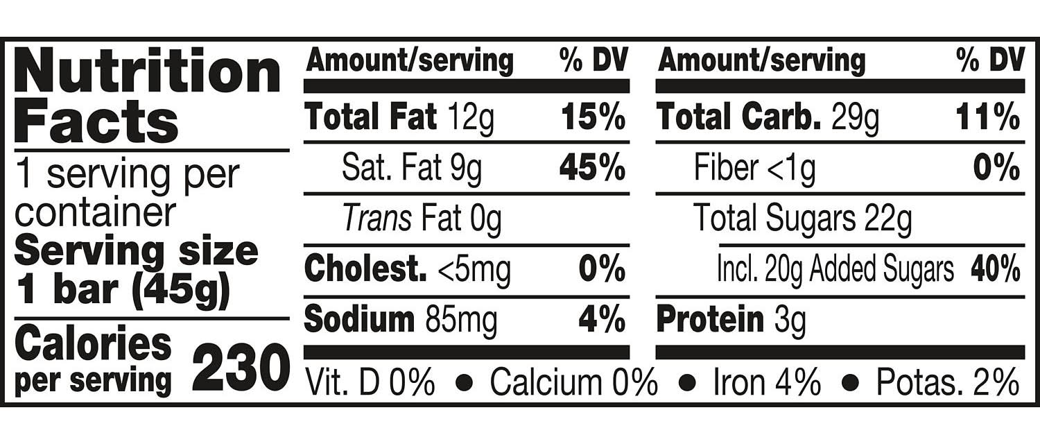 Ingredients: ugar; High Fructose Corn Syrup; Hydrogenated Vegetable Oil [Palm Kernel Oil; Coconut Oil; Soybean Oil]; Rice Flour; Vegetable Oil, [Palm Oil; Shea Oil; Sunflower Oil; Palm Kernel Oil; And/or Safflower Oil]; Partially Defatted Peanuts; Chocolate; Skim Milk; Corn Syrup Solids, Contains 2% or Less Of: Dairy Butter (Milk); Whey (Milk); Salt; Malt Extract; Mono- And Diglycerides; Lecithin (Soy); Monoglycerides; Molasses, Vanillin, Artificial Flavor; Disodium Phosphate. Contains: Corn, Soybeans, Peanuts, Milk