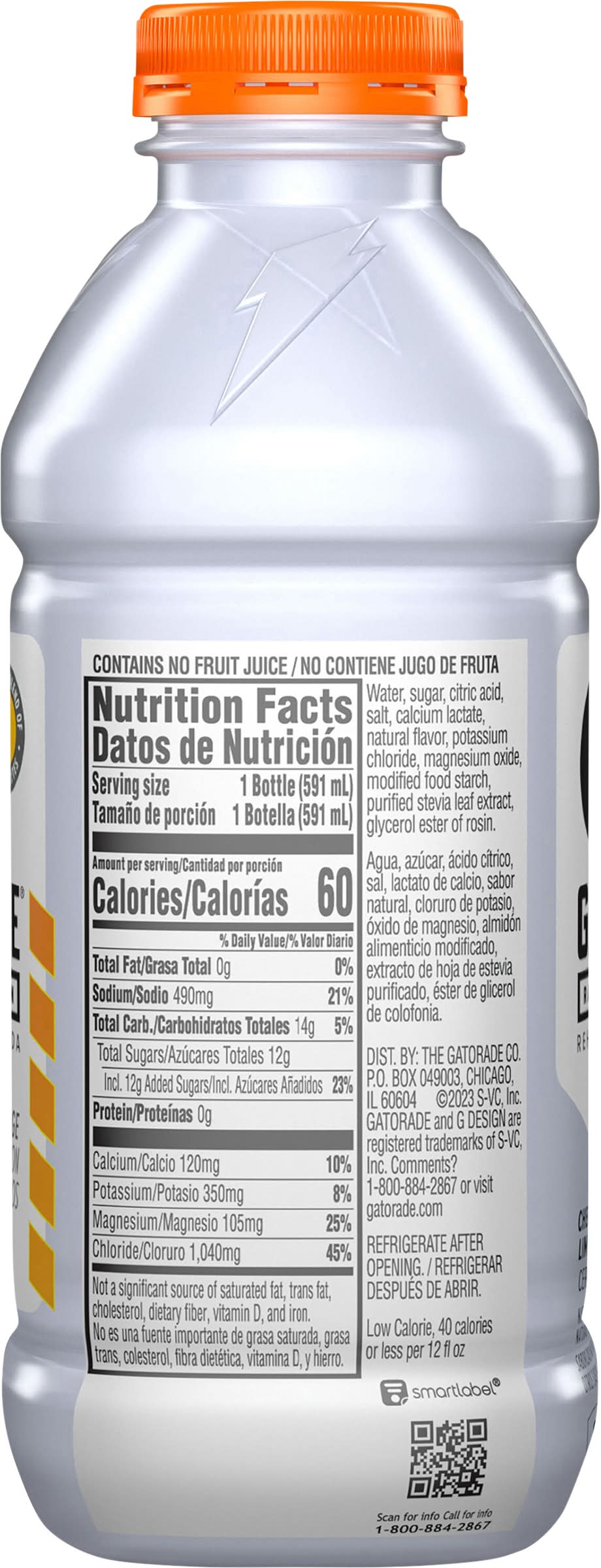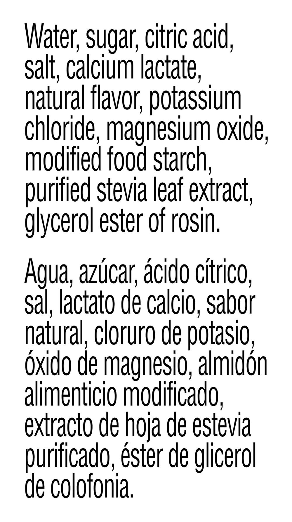 Ingredients: Water, Sugar, Citric Acid, Salt, Calcium Lactate, Natural Flavor, Potassium Chloride, Magnesium Oxide, Modified Food Starch, Purified Stevia Leaf Extract, Glycerol Ester of Rosin