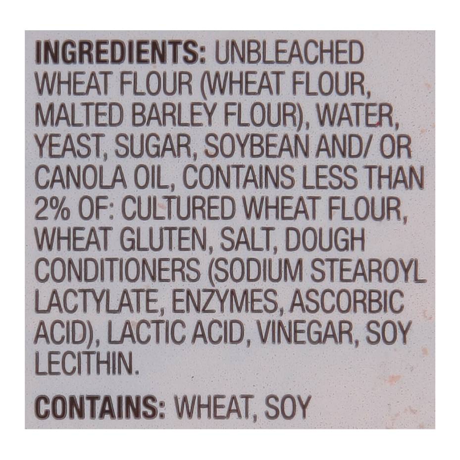 Ingredients: Unbleached Wheat Flour (Wheat Flour Malted Barley Flour), Water, Yeast, Sugar, Soybean and/or Canola Oil, Contains Less than 2% of: Cultured Wheat Flour, Wheat Gluten, Salt, Dough Conditioners (Sodium Stearoyl Lactylate Enzymes Ascorbic Acid), Lactic Acid, Vinegar, Soy Lecithin Contains: Wheat, Soybeans, Barley, Gluten