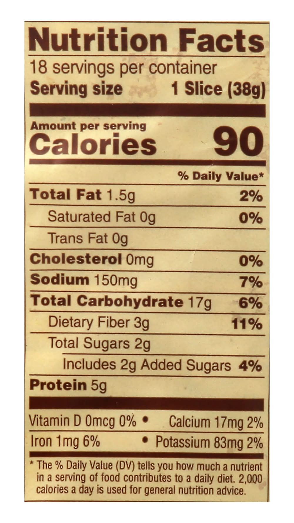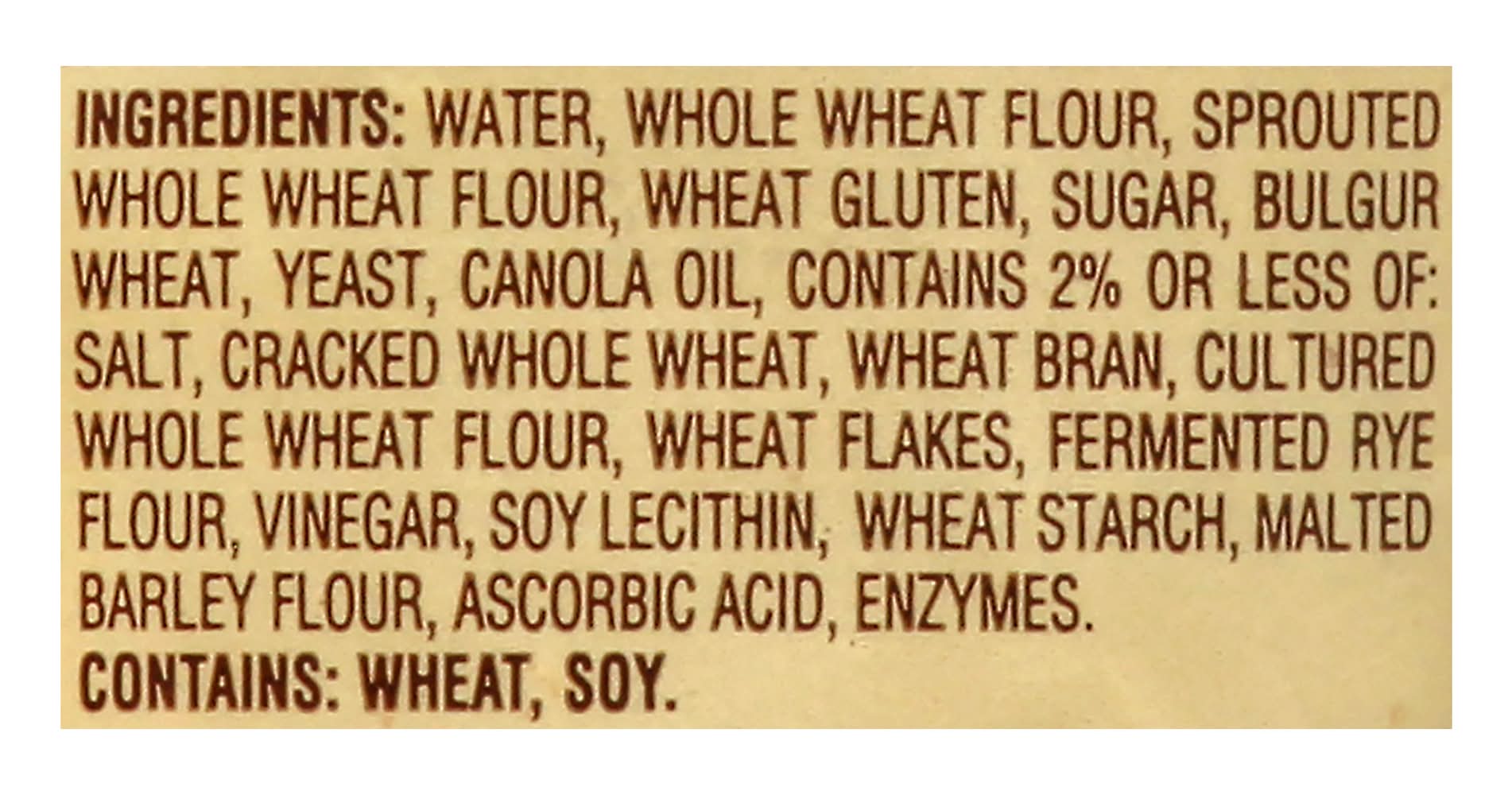 Ingredients: Water, Whole Wheat Flour, Sprouted Wheat Flour, Wheat Gluten, Sugar, Bulgur Wheat, Yeast, Canola Oil, Contains 2% or Less of: Salt, Cracked Whole Wheat, Wheat Bran, Cultured Whole Wheat Flour, Wheat Flakes, Fermented Rye Flour, Vinegar, Soy Lecithin, Wheat Starch, Malted Barley Flour, Ascorbic Acid, Enzymes Contains: Wheat, Soybeans, Gluten