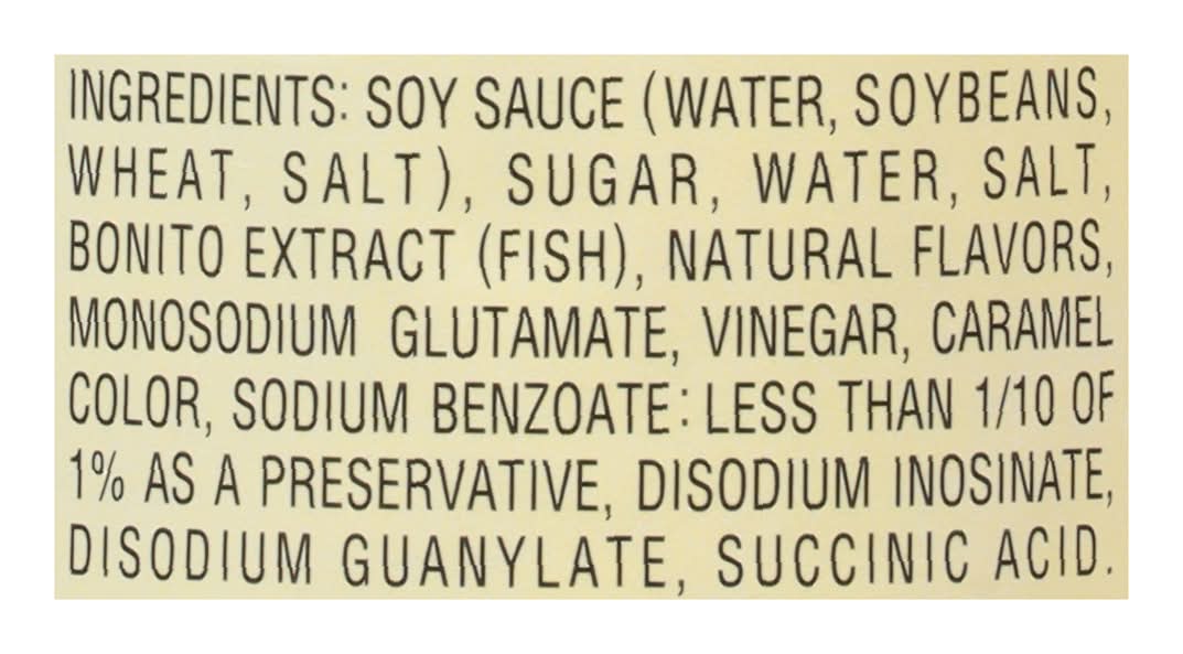 Ingredients: Soy Sauce (Water, Soybeans, Wheat, Salt), Sugar, Water, Salt, Bonito Extract (Fish), Natural Flavors, Monosodium Glutamate, Vinegar, Caramel Color, Sodium Benzoate: Less than 1/10 of 1% as a Preservative, Disodium Inosinate, Disodium Guanylate, Succinic Acid Contains: Soybeans, Wheat, Fish, Bonito, Fish