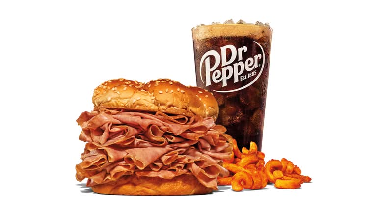 Two times the amount of signature roast beef than the Classic Roast Beef on a toasted sesame seed bun. Visit arbys.com for nutritional and allergen information.