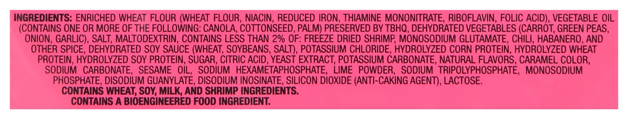 Ingredients: Enriched Wheat Flour (Wheat Flour, Niacin, Reduced Iron, Thiamine Mononitrate, Riboflavin, Folic Acid), Vegetable Oil (Contains One or More of the Following: Canola Cottonseed, Palm), Preserved by TBHQ, Dehydrated Vegetables (Carrot, Green Peas, Onion, Garlic), Salt, Maltodextrin, Contains Less than 2% of: Freeze Fried Shrimp, Monosodium Glutamate, Chili, Habanero, and Other Spice, Dehydrated Soy Sauce (Wheat, Soybeans, Salt), Potassium Chloride, Hydrolyzed Corn Protein, Hydrolyzed Wheat Protein, Hydrolyzed Soy Protein, Sugar, Citric Acid, Yeast Extract, Potassium Carbonate, Natural Flavors, Caramel Color, Sodium Carbonate, Sesame Oil, Sodium Hexametaphosphate, Lime Powder, Sodium Tripolyphosphate, Monosodium Phosphate, Disodium Guanylate, Disodium Inosinate, Silicon Dioxide (Anti-Caking Agent), Lactose Contains: Wheat, Crustacean Shellfish, Soybeans, Sesame, Lactose