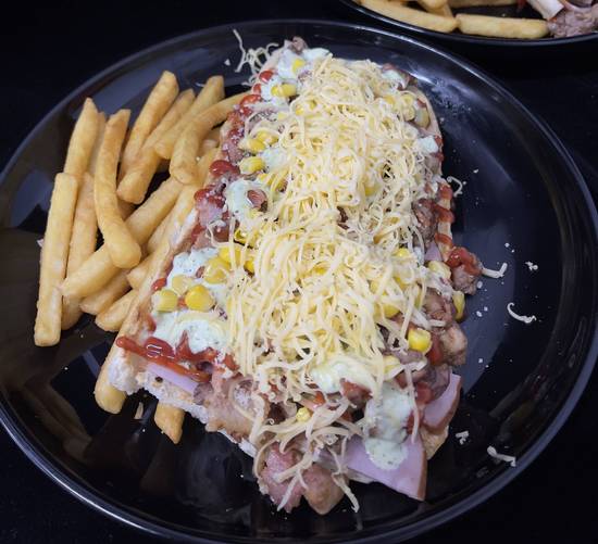 Lomito y pollo, tocineta, queso parmesano, maíz, jamón, queso amarillo rallado y salsas. Acompañado con papas fritas naturales.