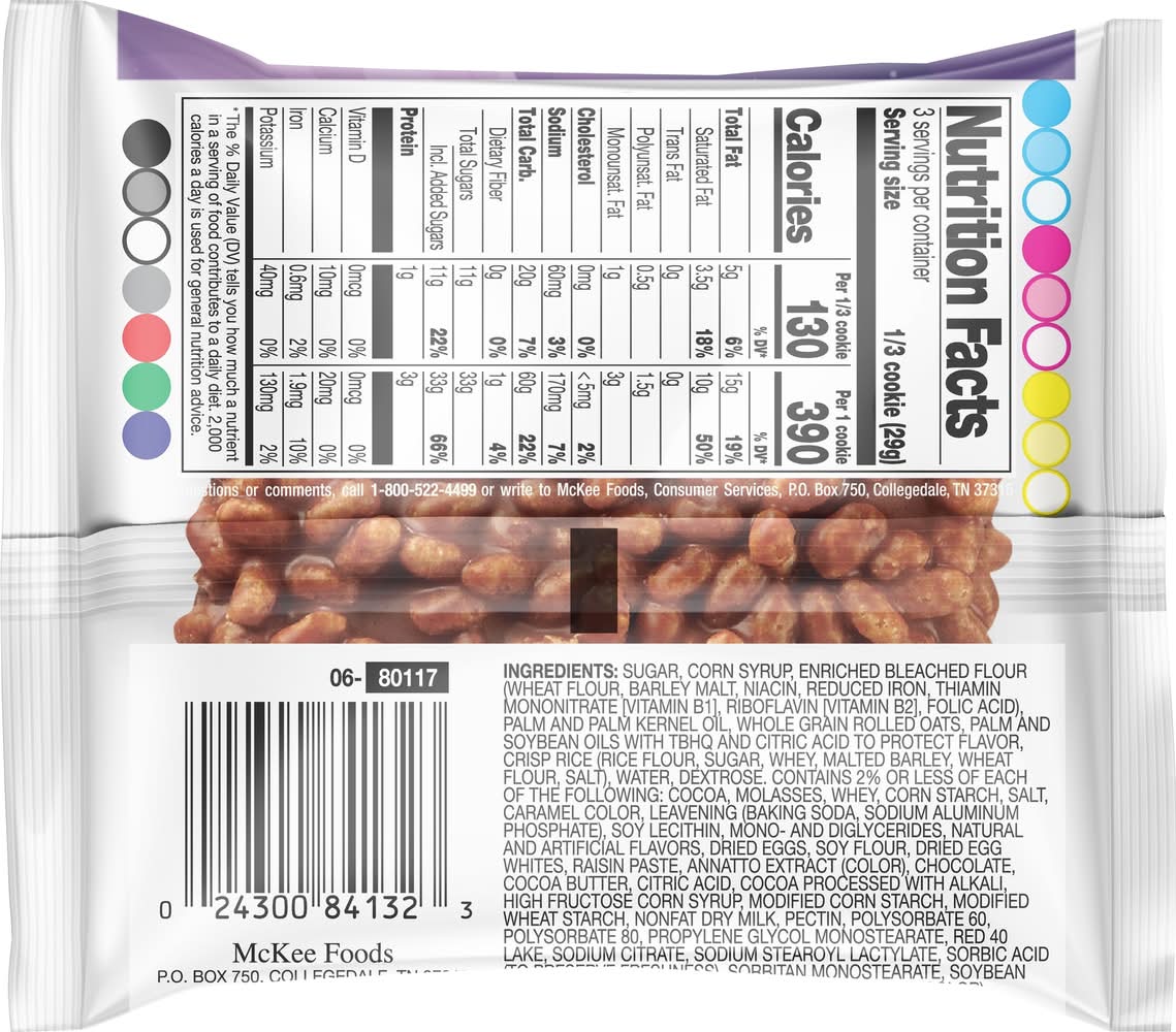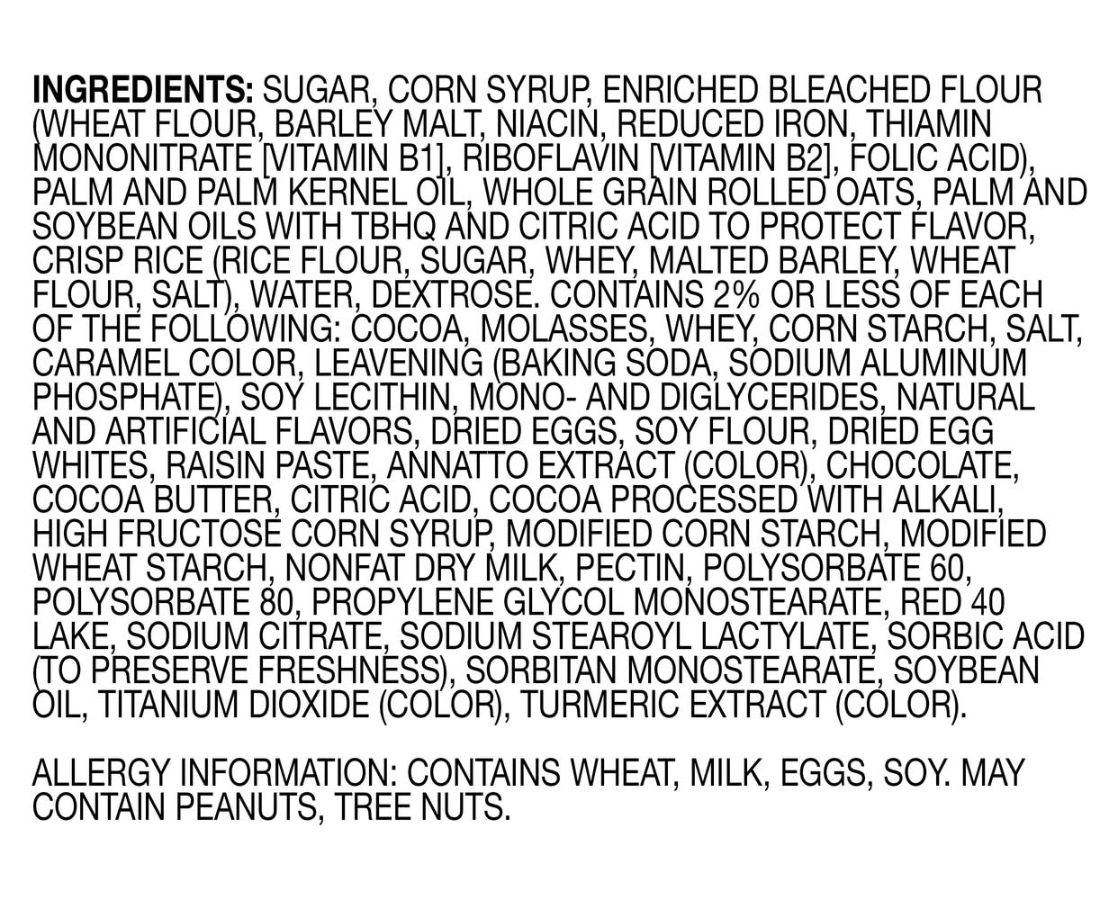 Ingredients: Sugar, Corn Syrup, Enriched Bleached Flour (Wheat Flour, Barley Malt, Niacin, Reduced Iron, Thiamin Mononitrate (Vitamin B1], Riboflavin [Vitamin B2], Folic Acid), Palm and Palm Kernel Oil, Whole Grain Rolled Oats, Palm and Soybean Oils with TBHQ and Citric Acid to Protect Flavor, Crisp Rice (Rice Flour, Sugar, Whey, Malted Barley, Wheat Flour, Salt), Water, Dextrose, Contains 2% or Less of Each of the Following: Cocoa, Molasses, Whey, Corn Starch, Salt, Caramel Color, Leavening (Baking Soda, Sodium Aluminum Phosphate), Soy Lecithin, Mono- and Diglycerides, Natural and Artificial Flavors, Dried Eggs, Soy Flour, Dried Egg Whites, Raisin Paste, Annatto Extract (Color), Chocolate, Cocoa Butter, Citric Acid, Cocoa Processed with Alkali, High Fructose Corn Syrup, Modified Corn Starch, Modified Wheat Starch, Nonfat Dry Milk, Pectin, Polysorbate 60, Polysorbate 80, Propylene Glycol Monostearate, Red 40 Lake, Sodium Citrate, Sodium Stearoyl Lactylate, Sorbic Acid (to Preserve Freshness), Sorbitan Monostearate, Soybean Oil, Titanium Dioxide (Color), Turmeric Extract (Color) Contains: Wheat, Milk, Eggs, Soybeans, Oat, Barley, Peanuts, Tree Nuts