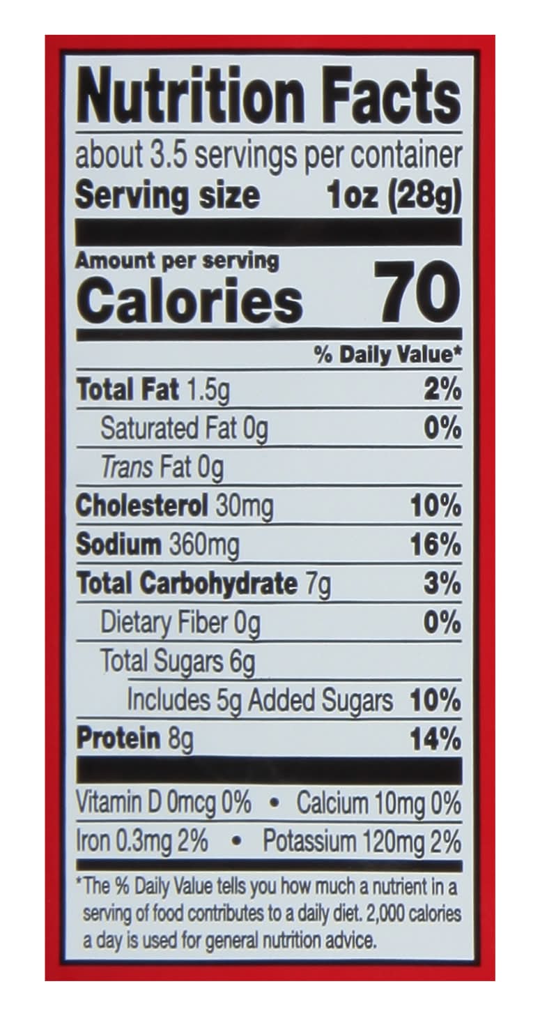 Ingredients: Chicken, Sugar, Water, Contains 2% or Less of Rice Bran, Sea Salt, Glycerin, Salt, Dried Jalapeno Pepper, Yeast Extract, Natural and Artificial Flavors, Vinegar, Citric Acid, Cultured Celery Extract, Maltodextrin, Modified Food Starch Contains: Celery