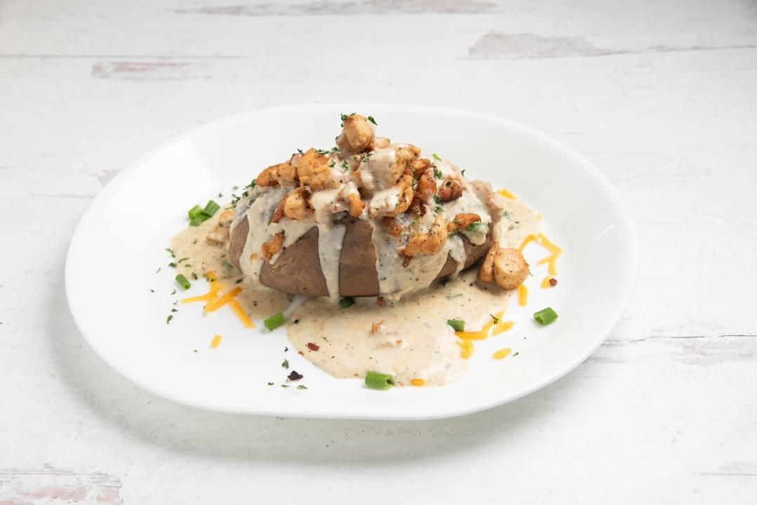 Loaded Potato stuffed with cheese, chives, chicken, and topped with our blackened chicken alfredo sauce.