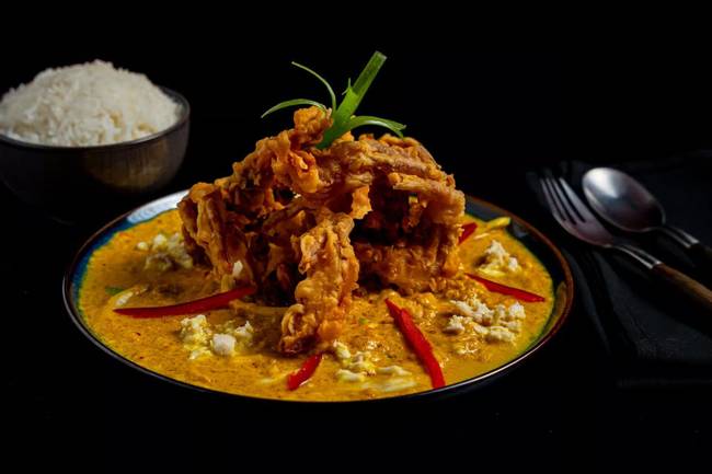 Spicy. Crispy soft shell crab, with turmeric crab meat curry.
