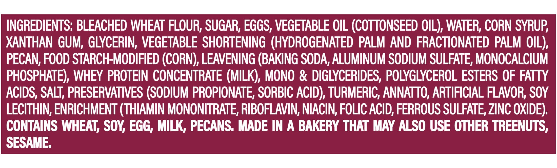 Ingredients: BLEACHED WHEAT FLOUR, SUGAR, EGGS, VEGETABLE OIL (COTTONSEED OIL), WATER, CORN SYRUP, XANTHAN GUM, GLYCERIN, VEGETABLE SHORTENING [HYDROGENATED PALM AND FRACTIONATED PALM OIL], PECAN, FOOD STARCH-MODIFIED (CORN), LEAVENING [BAKING SODA, ALUMINUM SODIUM SULFATE, MONOCALCIUM PHOSPHATE], WHEY PROTEIN CONCENTRATE (MILK), MONO DIGLYCERIDES, POLYGLYCEROL ESTERS OF FATTY ACIDS, SALT, PRESERVATIVES [SODIUM PROPIONATE, SORBIC ACID], TURMERIC, ANNATTO, ARTIFICIAL FLAVOR, SOY LECITHIN, ENRICHMENT [THIAMIN MONONITRATE, RIBOFLAVIN, NIACIN, FOLIC ACID, FERROUS SULFATE, ZINC OXIDE], . Contains: CONTAINS EGG, MILK, PECANS, SOY, WHEAT.