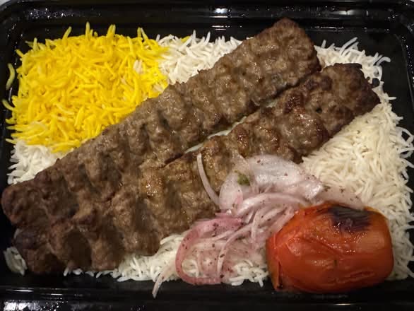Kabobs are served with basmati & saffron-scented rice and grilled tomato