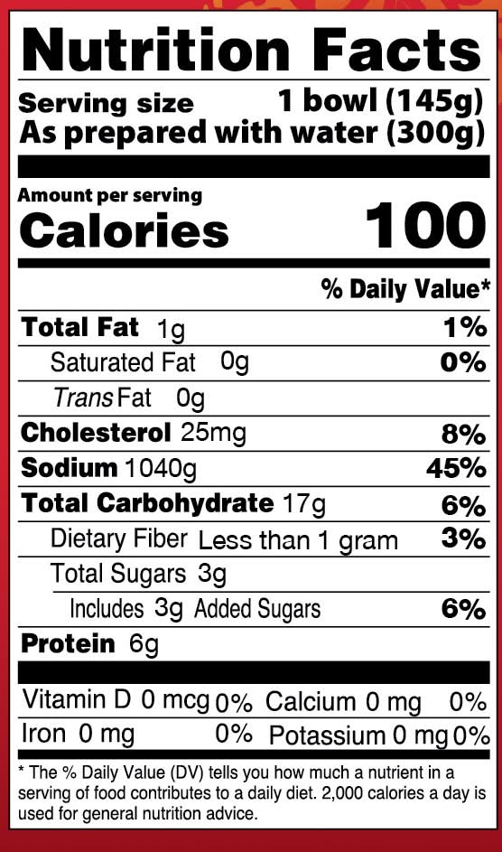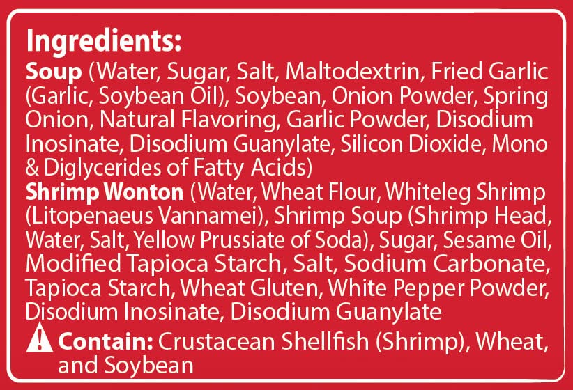Ingredients: Shrimp Wonton Whiteleg Shrimp Litopenaeus Vannamei, Water, Wheat Flour, Sesame Oil, Tapioca Starch, Modified Tapioca Starch, Sugar, Sodium Carbonate, Wheat Gluten, Salt, White Pepper Powder Soup Water, Sugar, Salt, Maltodextrin, Fried Garlic Garlic, Soybean Oil, Soybean, Onion Powder, Natural Flavor, Spring Onion, Garlic Powder, Disodium Inosinate, Disodium Guanylate. Contains: Crustacean Shellfish (Shrimp), Wheat, and Soybean
