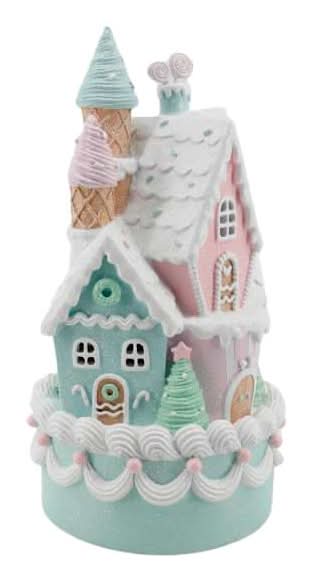 Enjoy a whimsical, candy-colored collection that takes you inside the kitchen with Mrs. Claus, sprinkled with pastel hues and sweet accents with items from our Mrs. Claus' Bakery Collection.Bring North Pole charm to your home with this 14in. LED Castle, a whimsical Christmas house that glows from within. Crafted of resin in a multicolor pastel finish with playful details and snow-kissed rooftops, it adds storybook magic to mantels, shelves, and entry tables. Warm LED illumination shines through the windows to create a cozy holiday ambiance. Display it solo or pair it with your winter village for a standout centerpiece. Ideal for tabletop decorating. A delightful addition to Christmas indoor decor, this lighted castle makes your seasonal scene feel extra merry.