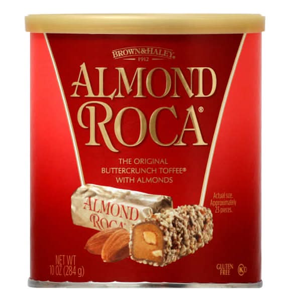 A delectable delight to enjoy.Enjoy the perfect blend of crunchy almonds, buttery toffee, and smooth milk chocolate with the Brown & Haley Almond Roca Canister. Crafted with passion, this irresistible treat is a delightful addition to any occasion. With a legacy of over 100 years, Brown & Haley has mastered the art of creating mouth-watering confections that tickle your taste buds. Whether you're treating yourself or looking for a memorable gift, the Almond Roca Canister will satisfy your sweet cravings and leave you wanting more. Crunchy almonds, buttery toffee, and smooth milk chocolate.Great for on-the-go enjoyment. Perfect for indulging or gifting.
