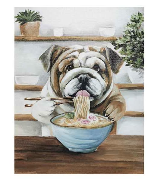 Add a whimsical touch to your home with our delightful 12x16in. A Dog with Ramen Canvas Wall Art. The multicolor canvas with bulldog eating ramen is also the perfect way to liven up a wall in your bathroom. Hanging it is easy with the attached hangers. This lighthearted art print is the perfect gift for any occasion including birthdays, housewarmings, holidays, and more. Treat someone or yourself to a piece of art that's sure to bring smiles.