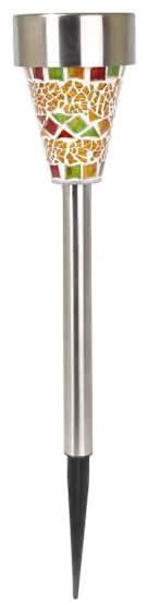 Our bright Solar Orange Mosaic Pathway Light shines brighter, longer, and stronger. Each path light has warm white LEDs with a glowing 2-lumens output. Plus, our Solar LED Path Stake Light is attractive and well-made, so it makes an elegant addition to your home. Built to last, they feature metal construction with clear glass that reflects even more light. The built-in solar panel allows for hours of light when fully charged. Quick and easy to assemble. Each light comes with rechargeable solar batteries and features an on/off switch. Lighting Type: LED Solar Color Temperature: Warm WhiteLumens: 2.4Solar Rechargeable BatteriesOn/Off Switch Base Material: MetalWindow Material: GlassColor: Orange