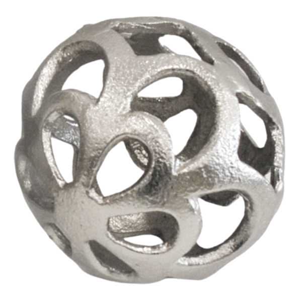 This silver metal cutout ball is a captivating addition to any room. Its unique design and intricate cutout pattern create a playful and artistic atmosphere. Whether displayed on a shelf, tabletop or mantel, this metal ball is sure to catch the eye and spark conversation.With its lightweight construction and sleek silver finish, this cutout ball effortlessly blends into a variety of decor styles, from modern to eclectic. Whether you want to add a touch of chic to your living room or a dash of charm to your office, this metal ball is the perfect choice. Made of metal for a sleek and modern look.Lightweight construction allows for easy placement and movement.Eye-catching cutout design. Measures 4in. L × 4in. W × 4in. H.