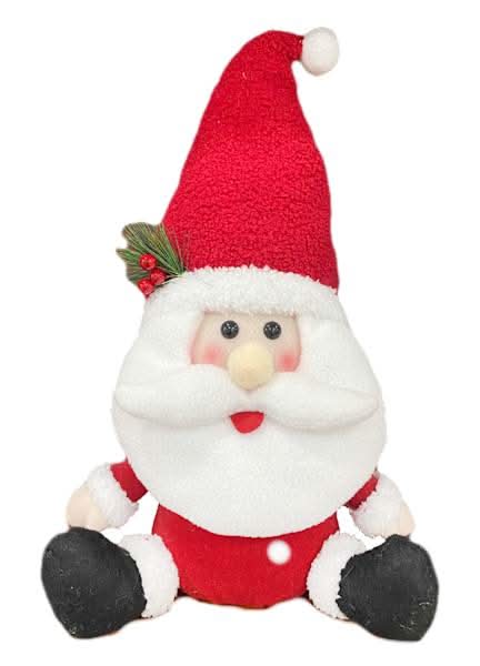 Bring playful motion to your holiday home with this 19in. fabric sitting Santa featuring a gently shaking head. The multicolor details, classic red suit, and snowy beard brighten mantels, shelves, and entry tables. Crafted with faux wood details and fabric accents for a cozy, collected look. This Santa is easy to style among garlands, stockings, and twinkle lights. A charming tabletop Santa figurine that completes your indoor Christmas decor and sparks smiles all season.