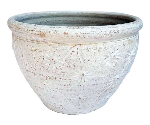 Highlight your green thumb and showcase your annuals and perennials at your front door or add a touch of festive foliage to your deck with our exotic 5in. Thai Chamomile white clay pot. More than just a spot to display your gardening skills, this whitewashed etched design planter has a charming appearance with its wonderful, rimmed design. Created to live indoors or out, it's ready to make your plants pop.