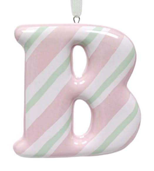 Enjoy a whimsical, candy-colored collection that takes you inside the kitchen with Mrs. Claus, sprinkled with pastel hues and sweet accents with items from our Mrs. Claus' Bakery Collection. Add a personal touch to your holiday tree with this pink pastel striped ceramic "B" monogram ornament. The timeless stripe pattern brings cheerful charm to Christmas decor, from branches to garlands. Made of ceramic with a smooth finish, it hangs easily and catches the light beautifully. Ideal for stockings or host gifts.