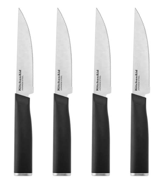 A slice of precision for every steak lover. Revamp your steak dining experience with the KitchenAid 4-Piece Classic Steak Knife Set. Crafted with utmost precision, these stylish steak knives effortlessly glide through even the juiciest cuts, ensuring a seamless and enjoyable dining experience. Combining sleek black handles with sharp metal blades, these knives not only look great but also promise long-lasting durability. Whether you're treating yourself to a mouthwatering ribeye or impressing guests with a perfectly cooked filet mignon, this knife set is your secret weapon in creating unforgettable dining moments. Effortlessly slices through meats for a flawless dining experience. Set includes four knives, perfect for steak nights with family and friends.Metal blades and plastic handles ensure long-lasting performance. Box measures 13in. L × 5.6in. W × 1in. H.