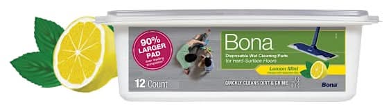 For a quick thorough clean, Bona® Wet Cleaning Pads feature a multi-layered design infused with Bona Hard-Surface Floor Cleaner. The pre-moistened pads quickly clean hard-surface floors effectively by removing dust, dirt and grime. The pads are perfect for spot cleaning and cleaning those unpleasant pet messes. These extra-large cleaning pads are specifically designed for use with the Bona Family of Mops. These pads won't scratch or damage your floor, and are safe for use on hard-surface floors like stone, tile, laminate and LVT. The Lemon Mint scent offers a burst of fresh citrus verbena and Meyer lemon together with dew covered mint leaves and subtle floral aspects. The scent contains essential oils of lemon, peppermint, and spearmint providing a long-lasting pleasant aroma. Love your floors with Bona. Sustainable Solutions for a cleaner & healthier home.™ Always waterbased and biodegradable - formulated without formaldehyde, ammonia, petroleum, phosphates, phthalates and parabens Clean quicker with a 90% larger pad than the leading competitor Protect your floor from discoloration and harm with our pH neutral formulation. Safe for hard-surface floors like stone, no-wax sealed tile, laminate and luxury vinyl (LVT) Fits all Bona branded mops Packaging may vary Packaging: Reusable