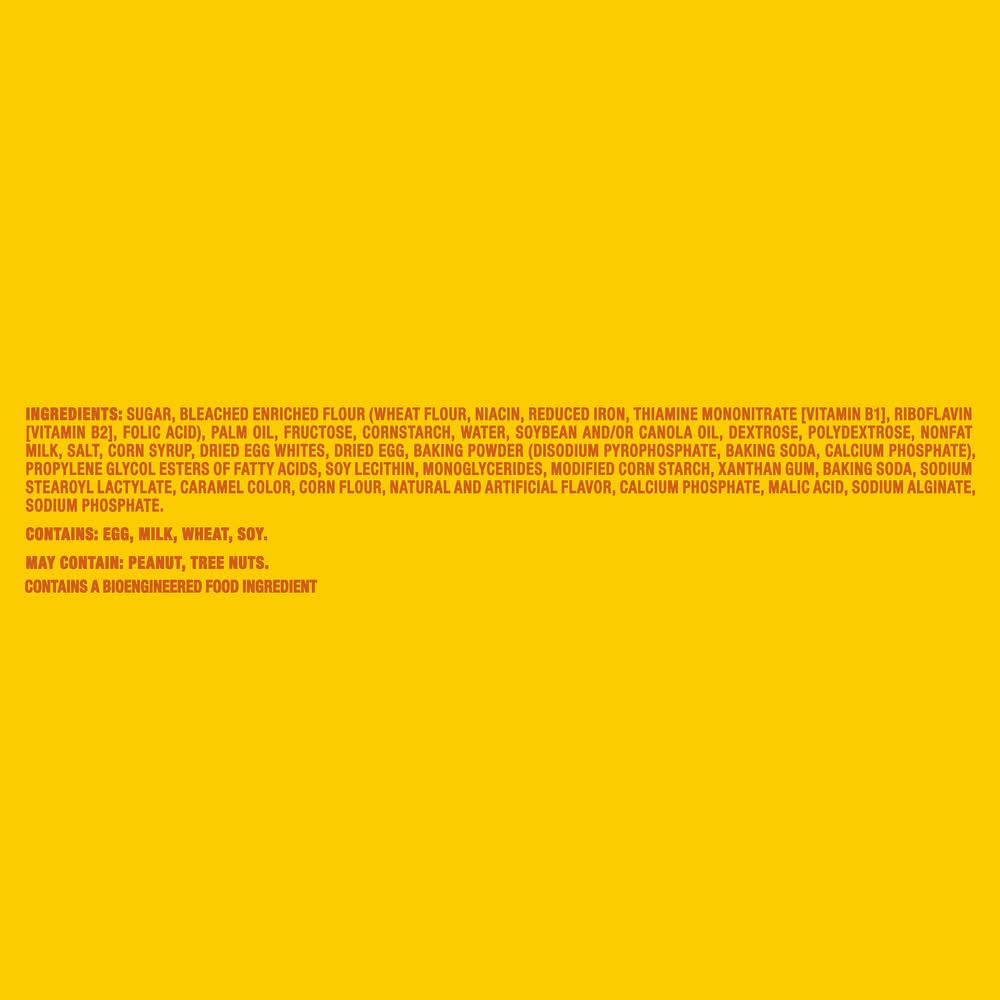Ingredients: INGREDIENTS: SUGAR, BLEACHED ENRICHED FLOUR (WHEAT FLOUR, NIACIN, REDUCED IRON, THIAMINE MONONITRATE [VITAMIN B1], RIBOFLAVIN [VITAMIN B2], FOLIC ACID), PALM OIL, FRUCTOSE, CORNSTARCH, WATER, SOYBEAN AND, OR CANOLA OIL, DEXTROSE, POLYDEXTROSE, NONFAT MILK, SALT, CORN SYRUP, DRIED EGG WHITES, DRIED EGG, BAKING POWDER (DISODIUM PYROPHOSPHATE, BAKING SODA, CALCIUM PHOSPHATE), PROPYLENE GLYCOL ESTERS OF FATTY ACIDS, SOY LECITHIN, MONOGLYCERIDES, MODIFIED CORN STARCH, XANTHAN GUM, BAKING SODA, SODIUM STEAROYL LACTYLATE, CARAMEL COLOR, CORN FLOUR, NATURAL AND ARTIFICIAL FLAVOR, CALCIUM PHOSPHATE, MALIC ACID, SODIUM ALGINATE, SODIUM PHOSPHATE.CONTAINS: EGG, MILK, WHEAT, SOY.MAY CONTAIN: PEANUT, TREE NUTS. Contains: Egg, Milk, Wheat, Soy, Peanut, Treenuts