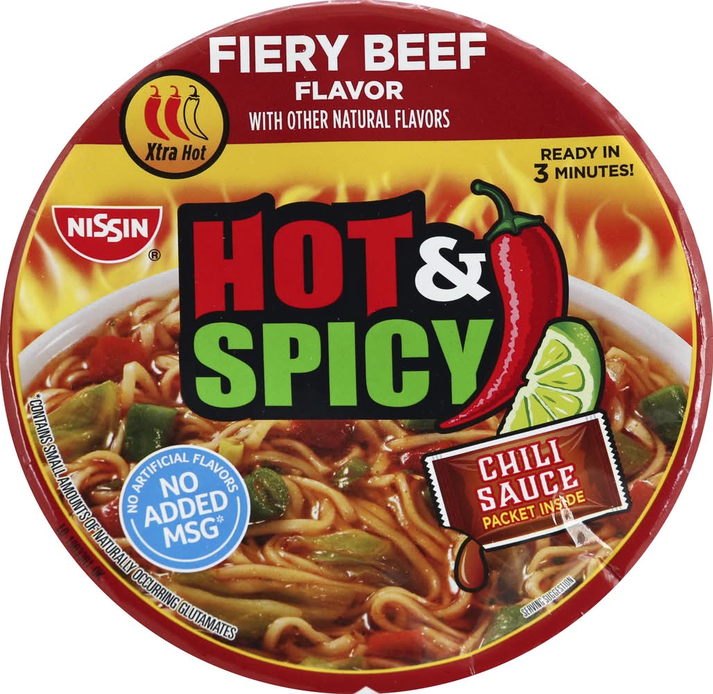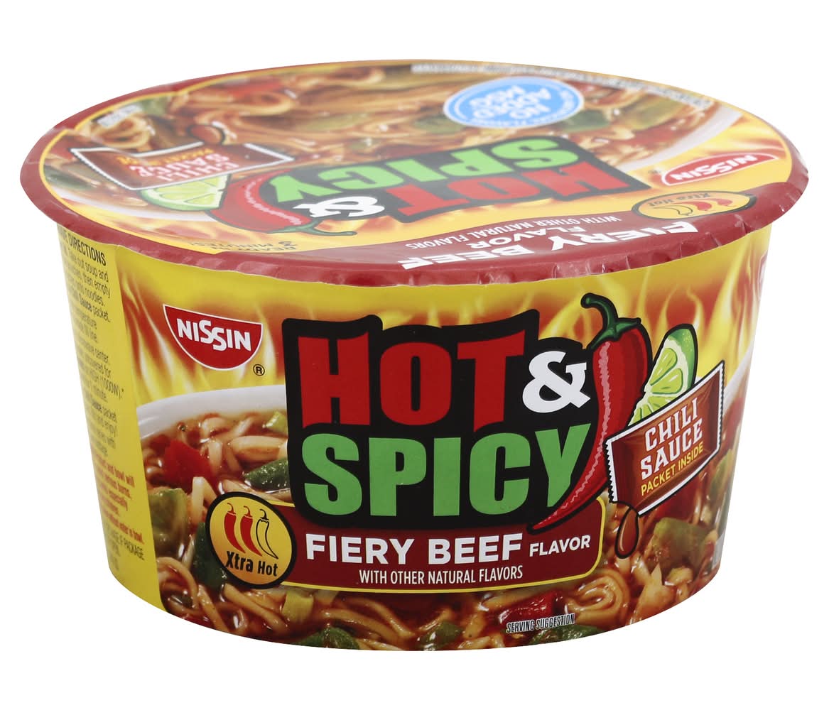 Chili sauce packet inside. Ready in 3 minutes. • Brand: Nissin • Flavor: Fiery beef • Nissin Foods (USA) Co., Inc., 2001 W. Rosecrans Ave, Gardena, CA, 90249