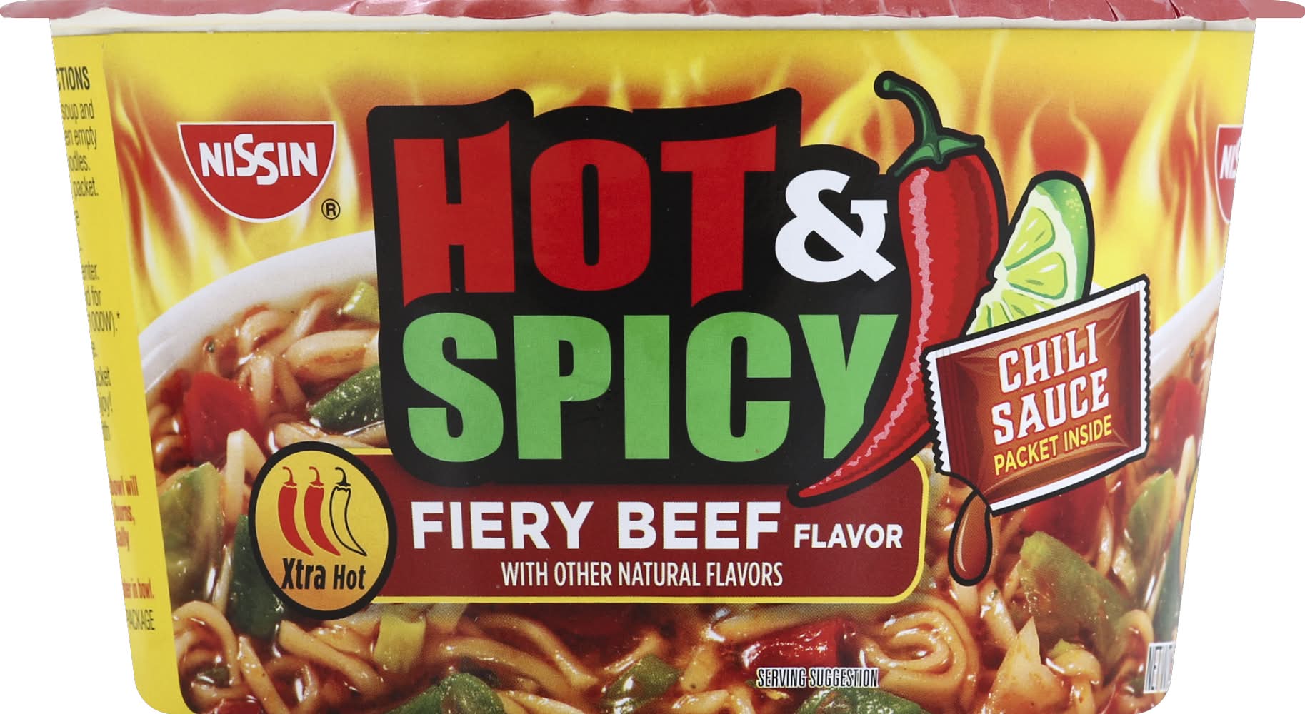 Nissin Hot & Spicy Ramen Noodle Soup, Fiery Beef (3.3 oz)