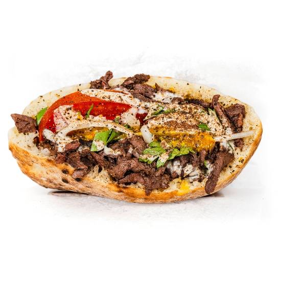 Wagyu Beef, Tomato, Onion, Parsley, Tahini and Amba Sauce in a Freshly Baked Pita.