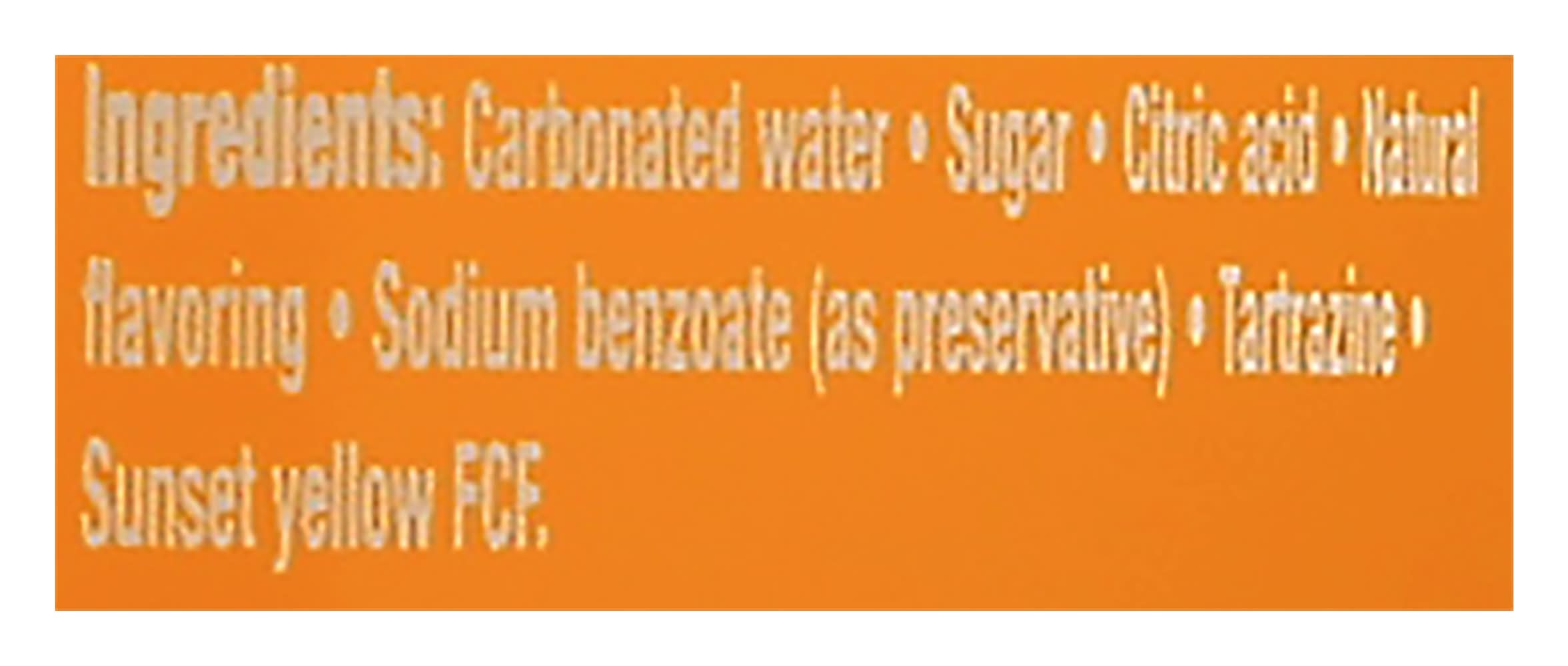 Ingredients: Carbonated Water, Sugar, Citric Acid, Natural Flavoring, Sodium Benzoate (as Preservative), Tartrazine, Sunset Yellow FCF