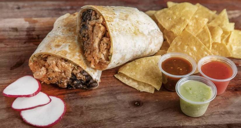 Large flour tortilla filled with seasoned jasmine rice, black beans with epazote herbs, 3-mix tillamook cheese, and choice of protein or veggie dish. Served with a side of crunchy corn tortilla chips.