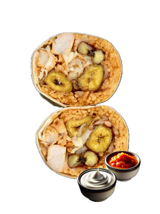 A soft 12-inch flour tortilla filled with flavorful Mexican rice, hearty pinto beans, sweet fried plantains, and melted mozzarella cheese. Served with sour cream and a vibrant red salsa on the side for a perfect balance of flavors.