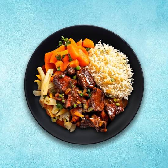 Oxtail prepared with carrot, yellow onion, salt and pepper and cooked in oil. Served with a side of rice,beans,mac & cheese, cabbage and mix veggies.