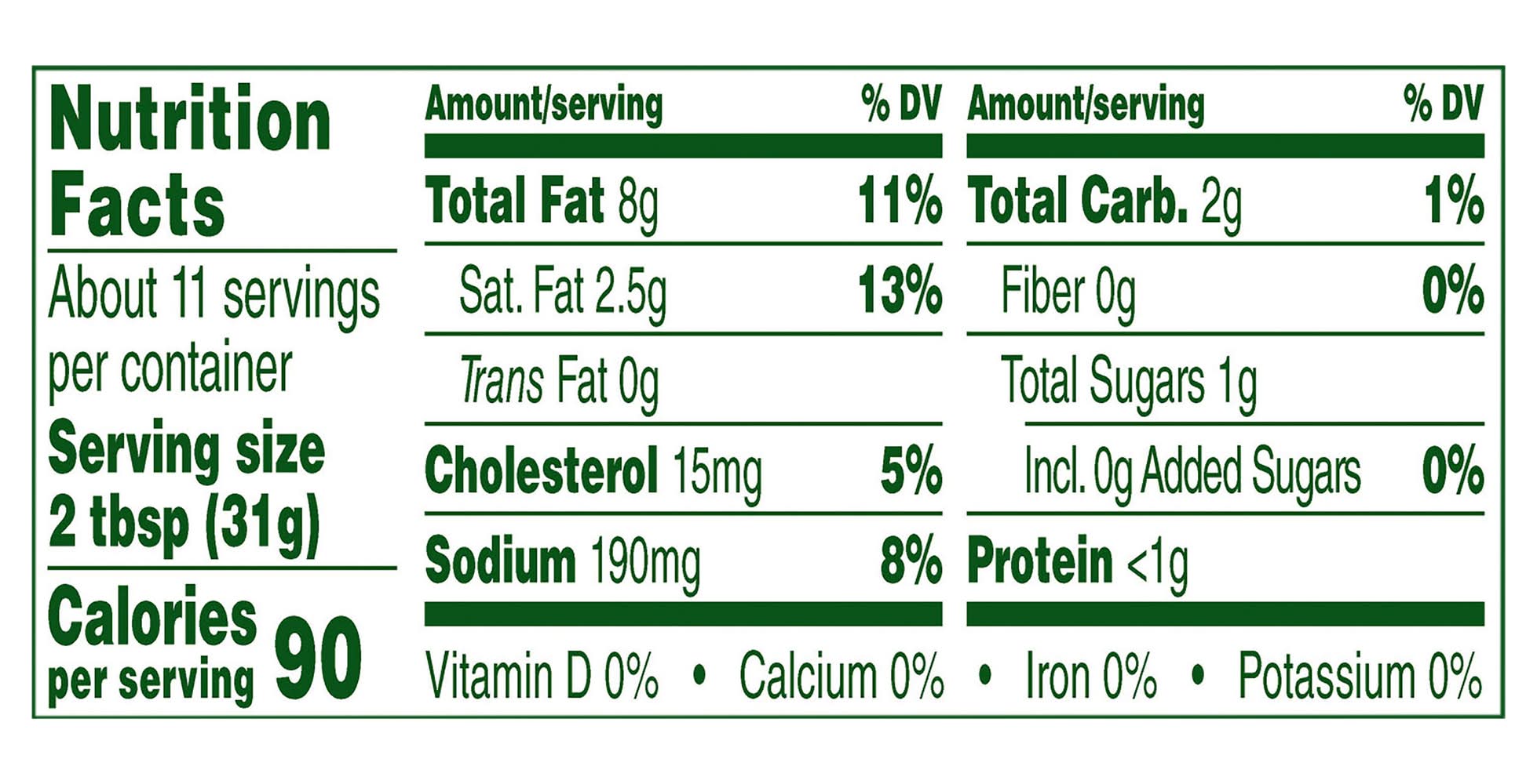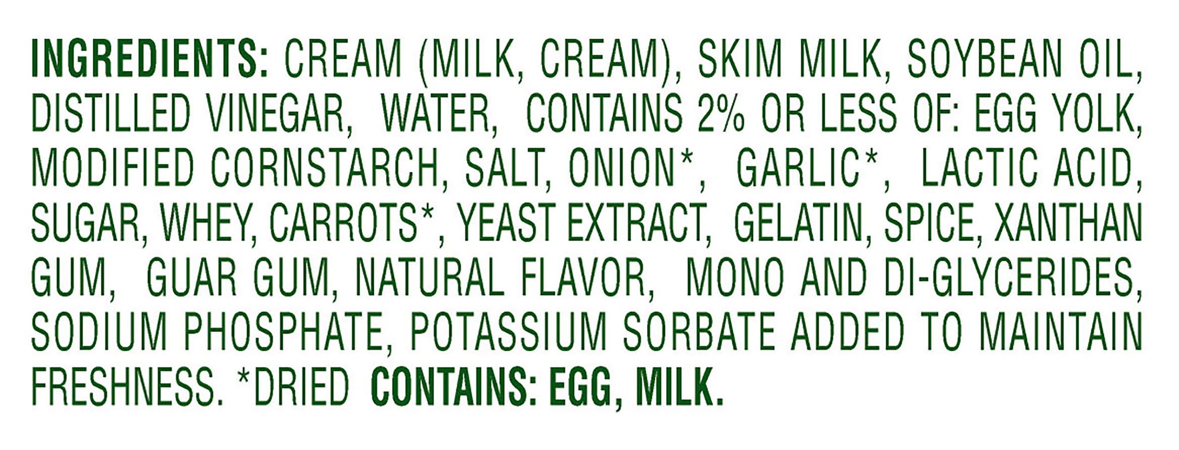 Ingredients: Cream (Milk, Cream), Skim Milk, Soybean Oil, Distilled Vinegar, Water, Contains 2% or less of: Egg Yolk, Modified Cornstarch, Salt, Onion*, Garlic*, Lactic Acid, Sugar, Whey, Carrots*, Yeast Extract, Gelatin, Spice, Xanthan Gum, Guar Gum, Natural Flavor, Mono and Di-Glycerides, Sodium Phosphate, Potassium Sorbate added to maintain freshness, *Dried Contains: Eggs, Milk, Soybeans, Corn